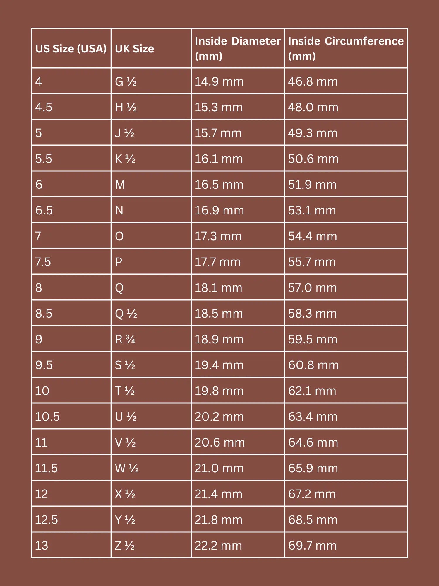 Match Your Size: Use your measurement (in mm) to find your corresponding US size in our chart below.