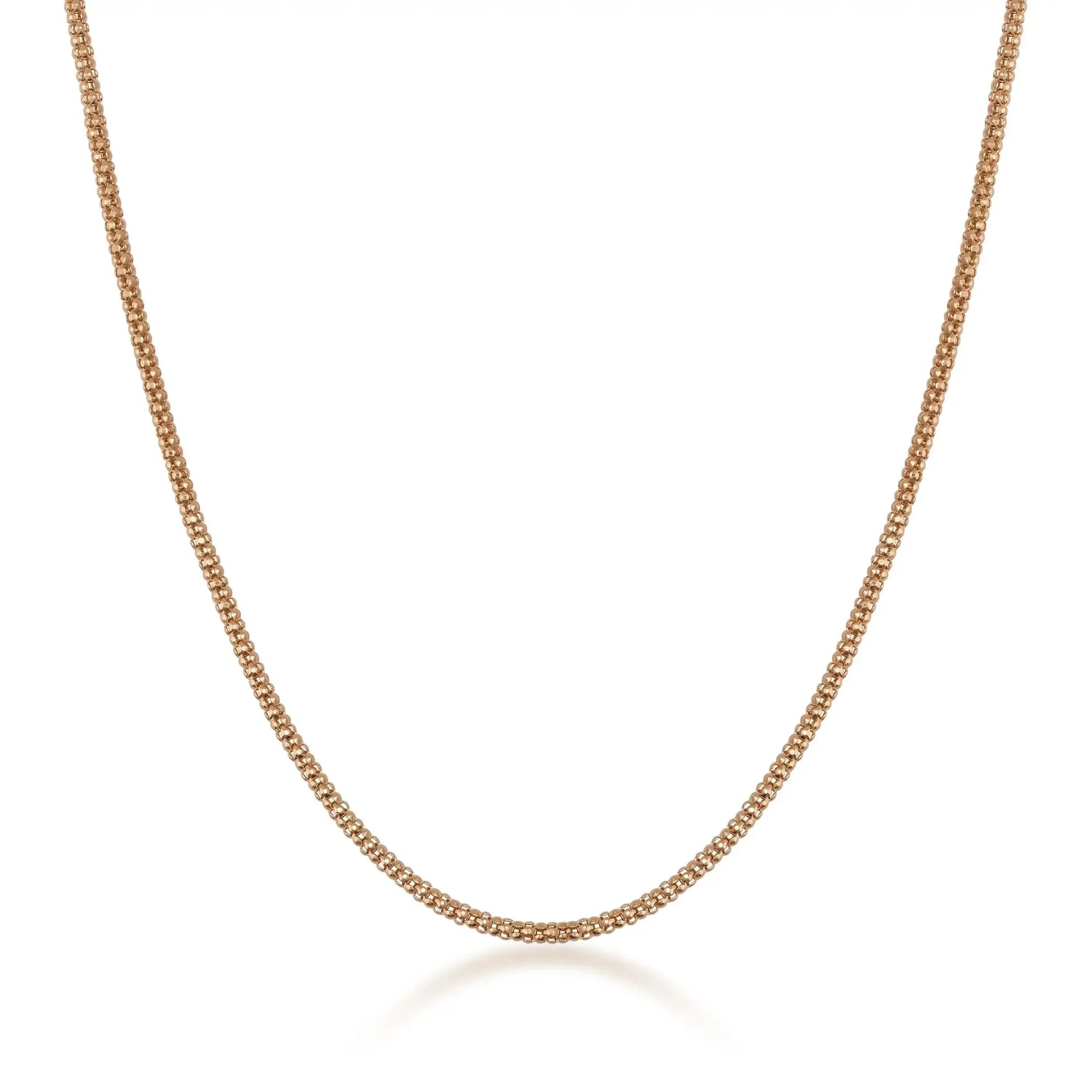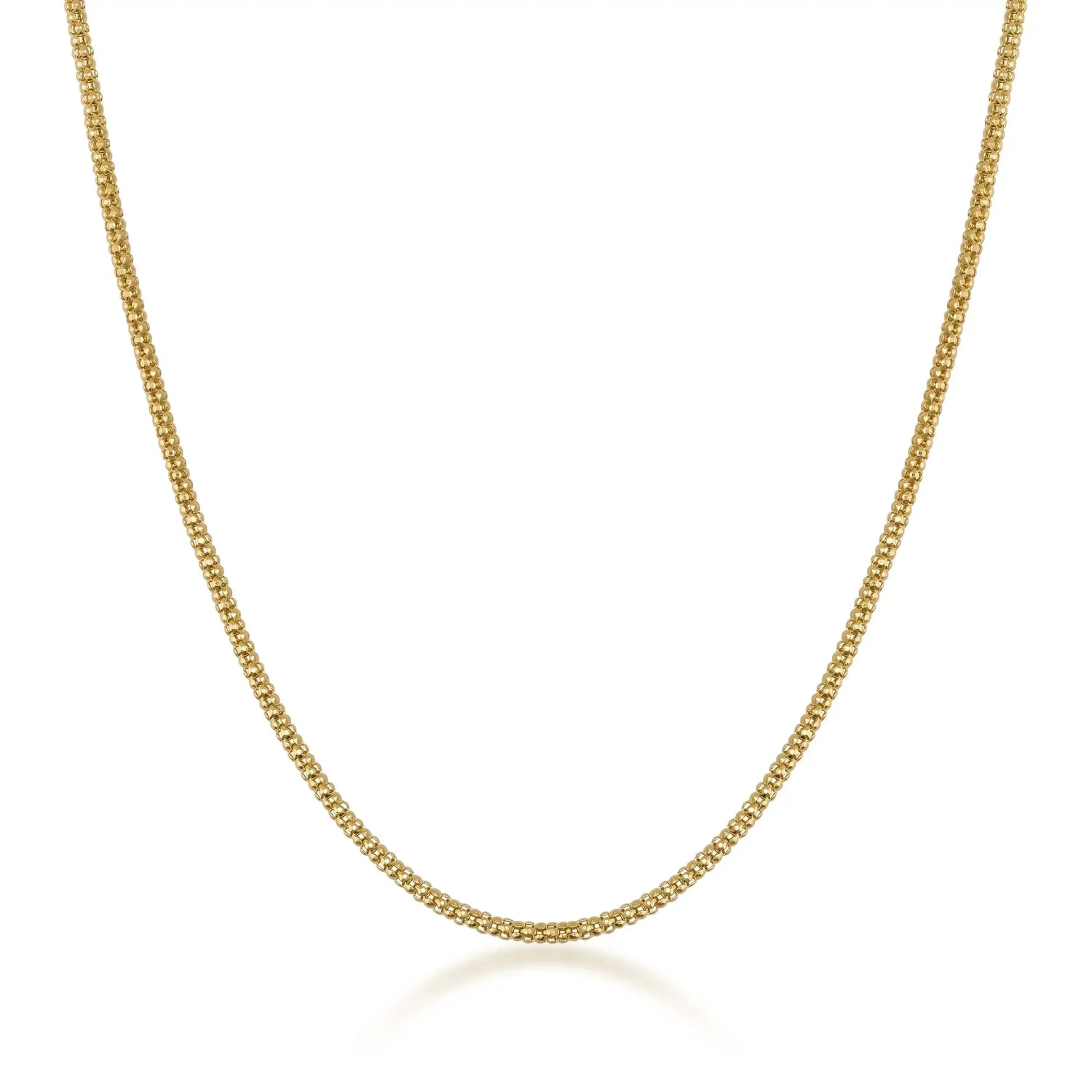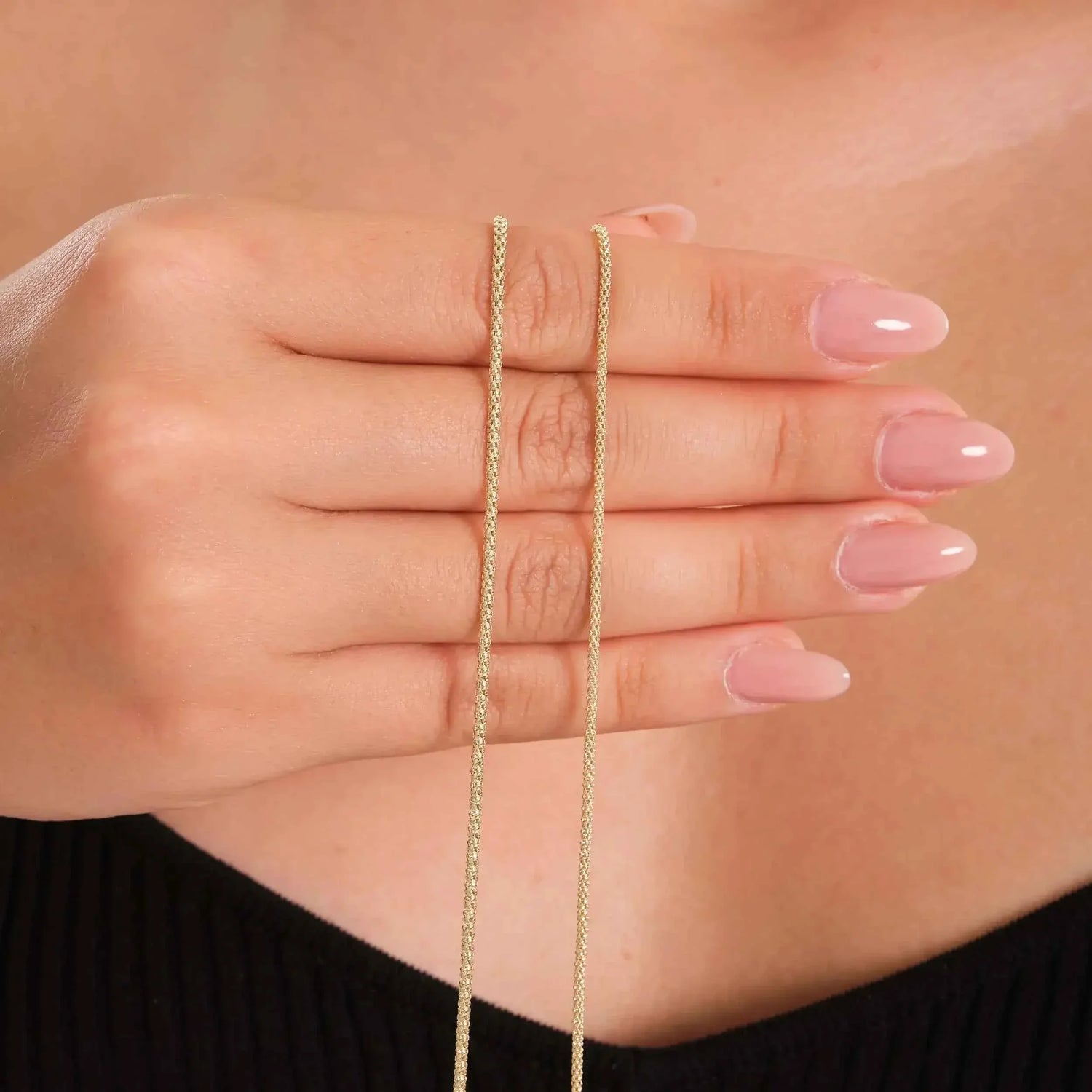 Crafted in authentic 14K gold (0.585 purity), this Popcorn Chain features concave, domed links that mimic the shape of popped kernels, offering a unique texture and light-reflecting surface. Each individual link is solid, carved with precision, and strung closely for a smooth, flexible drape. Despite its bold aesthetic, the design maintains a balanced weight-to-thickness ratio, making it comfortable to wear daily. Finished with a secure lobster claw clasp.