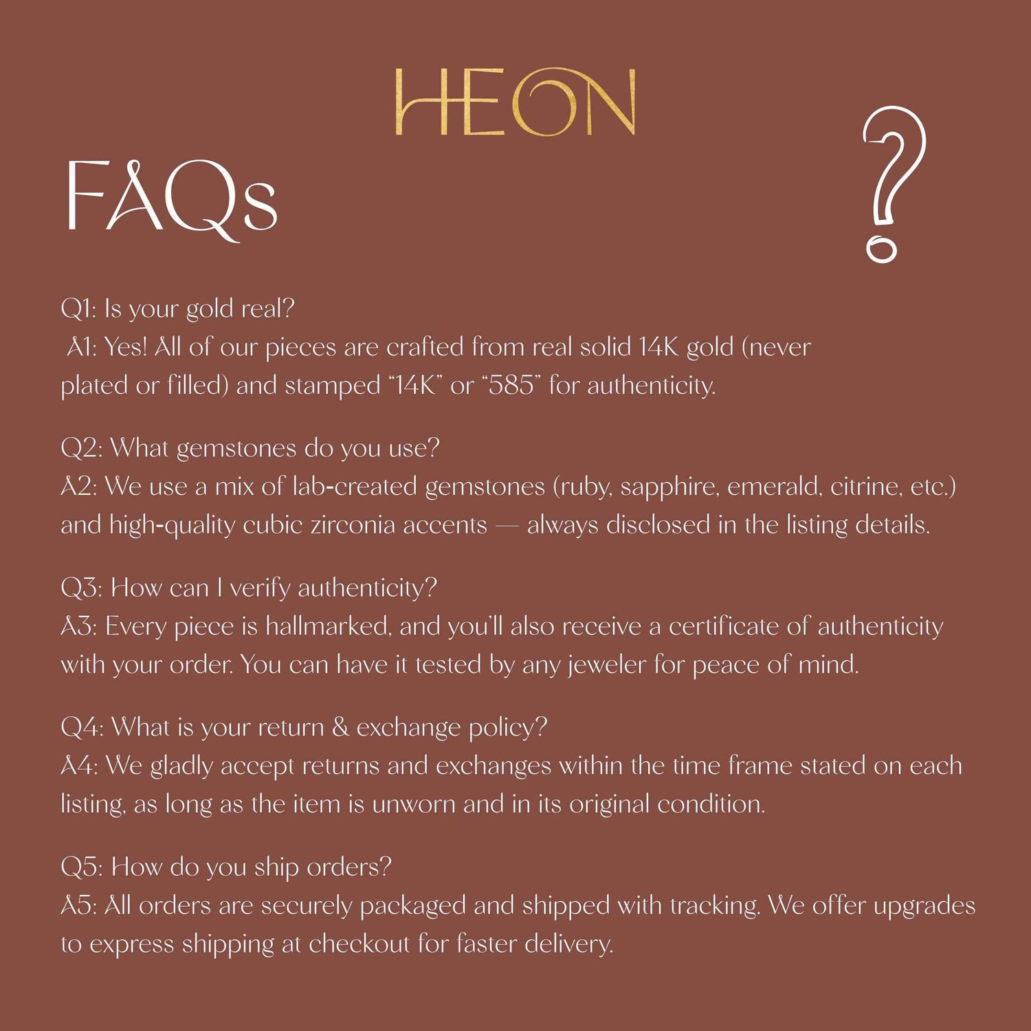 All of our jewelry is crafted from real, certified 14K solid gold — never plated, never filled. At Heon, we combine timeless craftsmanship with ethical sourcing to create meaningful pieces made to last a lifetime. Every order is shipped with care, insured, and backed by our customer-first service policy. Whether you‘re gifting or treating yourself, shop with confidence knowing you’re getting authentic fine jewelry designed with purpose.