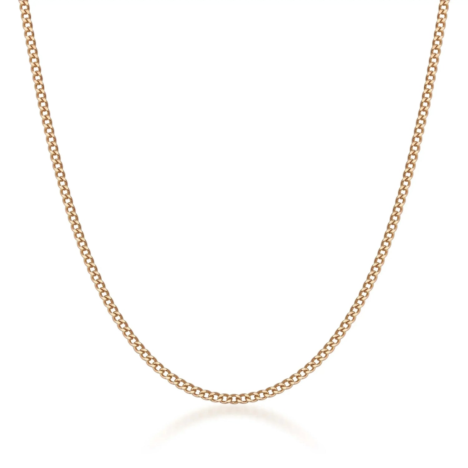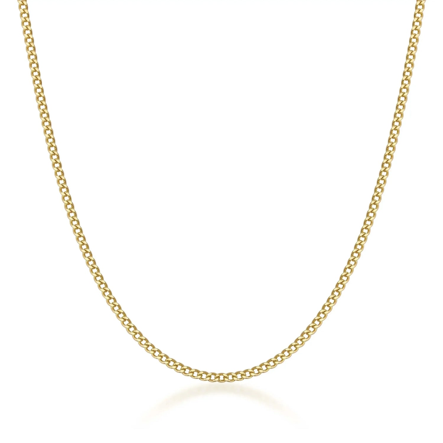This flat curb chain features tightly connected links with a smooth, low-profile design. Crafted with precision, its sleek and polished surface provides a classic look that pairs well with any pendant or stands elegantly on its own. The chain is secured with a durable lobster claw clasp and is available in multiple thickness options to suit your style preferences.